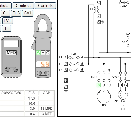 | If the Volt button is clicked it will turn green to indicate that the meter is in Volts mode. When the meter is placed in the voltage mode, one test point is automatically selected. This is typically L1 or L2. You may now select a second test point with the mouse cursor and the meter will display the voltage potential between those 2 points. A volt meter reports a voltage potential across an open circuit and across loads. If you wish to use a different default test point, click the volt button again and the next available test point will turn green. Remember that you can click the Note button while you are getting accustomed to the user interface. |